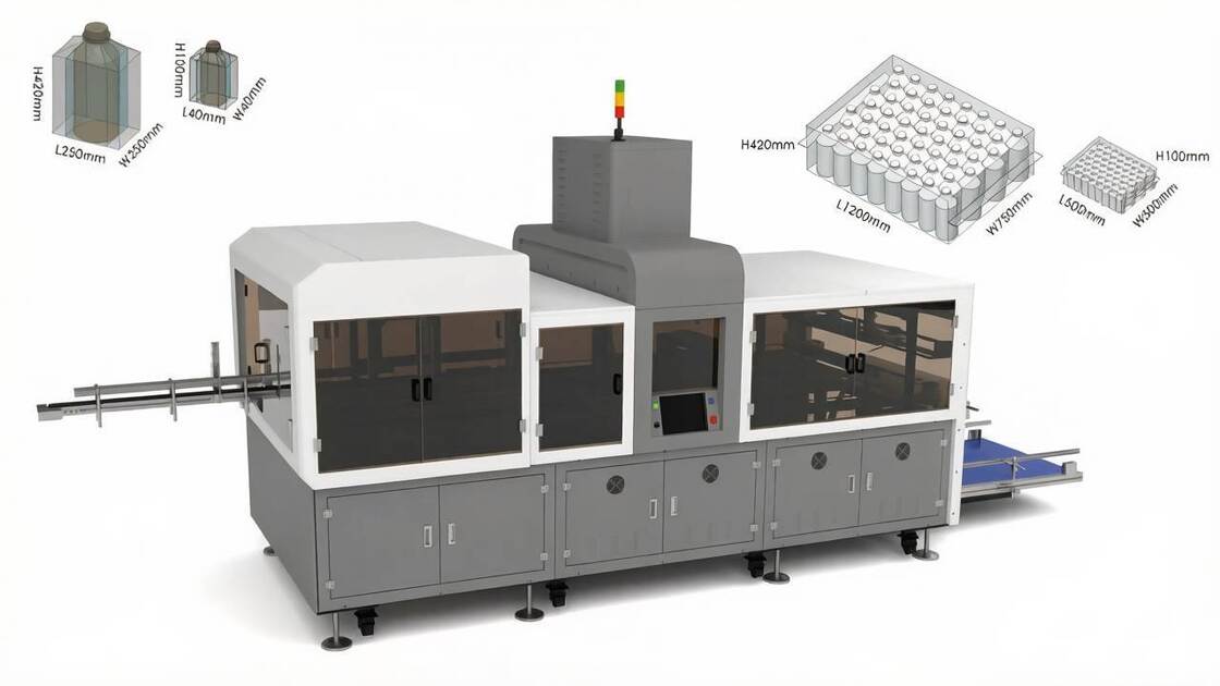 This medium-sized automatic packaging machine features quick production changeover and easy machine adjustment. With vertically arranged encapsulation and bottle conveying system, it automatically supplies bags and is suitable for all industries handling 2-20L bottles. Maximum encapsulation molding size reaches 1200mm × 750mm × 420mm. For 2L bottles, production capacity typically reaches approximately 3,000-4,000 bottles per hour.